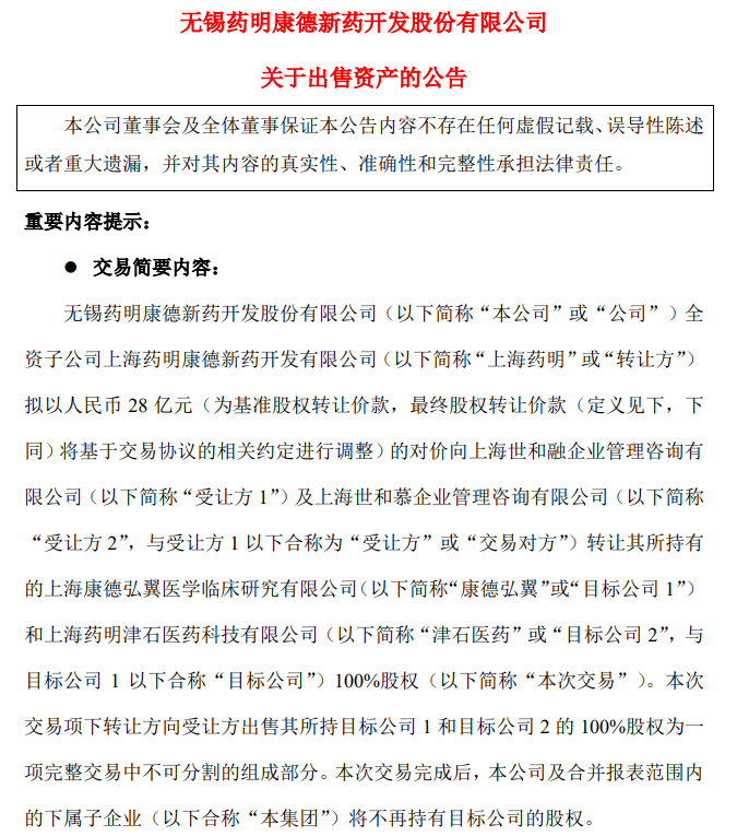 高瓴拟斥资28亿买下药明康德旗下康德弘翼和津石医药