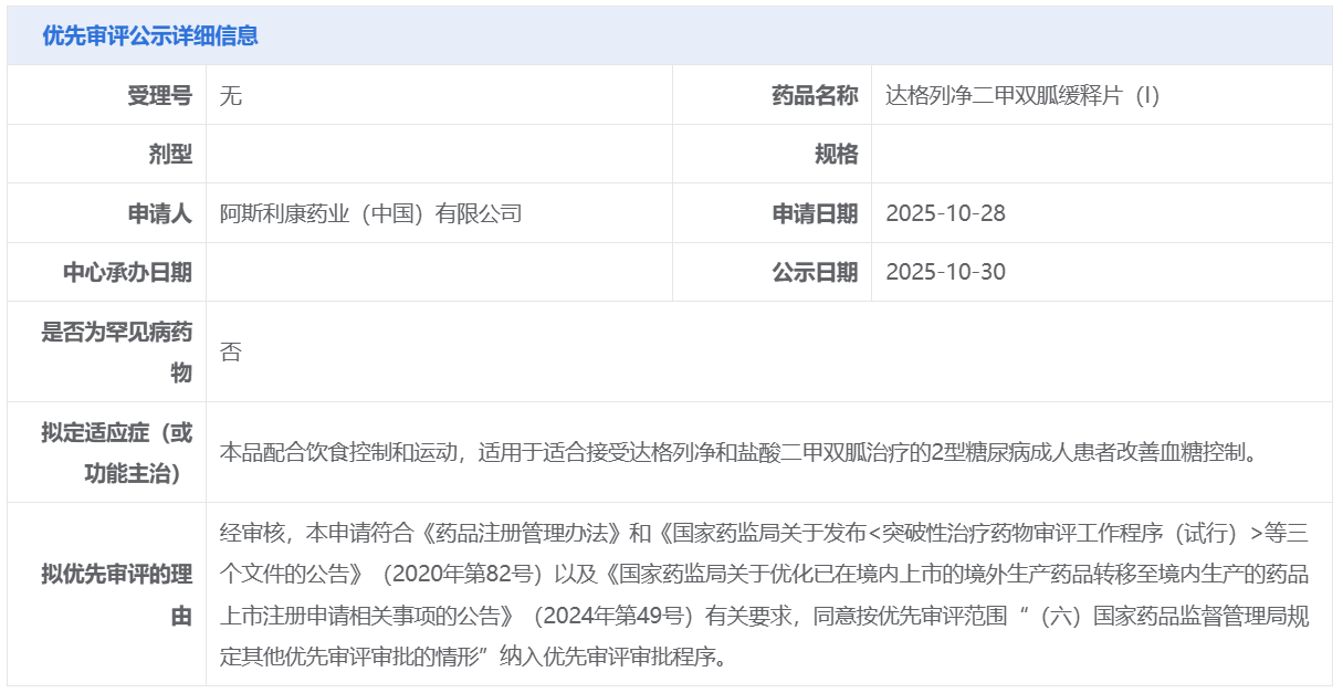 阿斯利康的达格列净二甲双胍缓释片(I)获CDE拟纳入优先审评