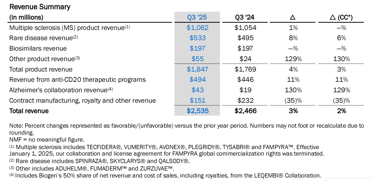 Biogen Inc. (Nasdaq: BIIB) today reported third quarter 2025 financial results. Commenting on the quarter,President and Chief Executive Officer Christopher A. Viehbacher said:
