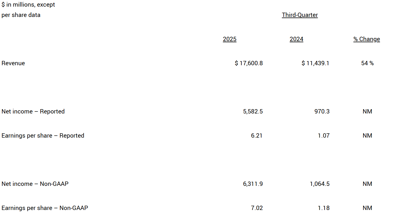 In Q3 2025, net income and earnings per share (EPS) were $5.58 billion and $6.21, respectively, compared with net income of $970.3 million and EPS of $1.07 in Q3 2024. EPS in Q3 2025 and Q3 2024 included acquired IPR&D charges of $0.71 and $3.08, respectively.