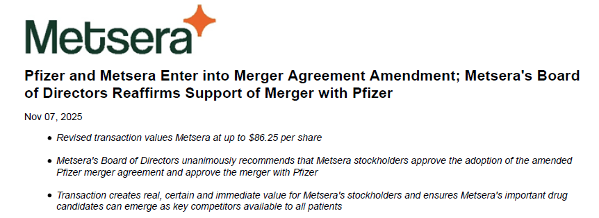 近日,辉瑞已与Metsera 达成最终收购协议,交易总金额最高可达100 亿美元。根据协议,辉瑞将以每股 86.25 美元的价格收购 Metsera 全部股权,其中包括每股65.60 美元的预付现金,以及最高每股20.65美元的或有价值权(CVR),该部分款项将根据药物研发及商业化的里程碑达成情况支付。