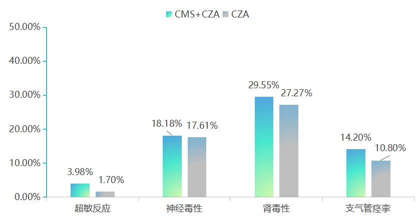 安全性方面,卡方检验发现联合治疗组与单药治疗组在超敏反应(P=0.199)、神经毒性(P=0.889)、肾毒性(P=0.636)、支气管痉挛发生(P=0.334)等不良事件的发生率上,均无统计学差异,表明CMS与CZA联用并未增加额外安全风险。