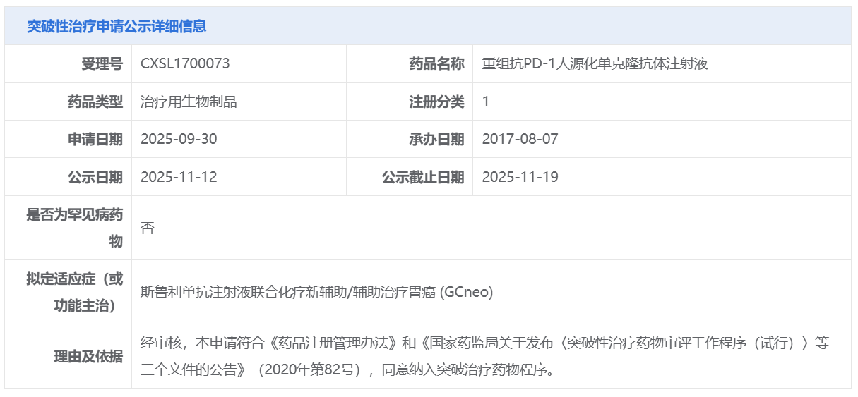 复宏汉霖的重组抗PD-1人源化单克隆抗体注射液获CDE拟纳入突破性治疗品种