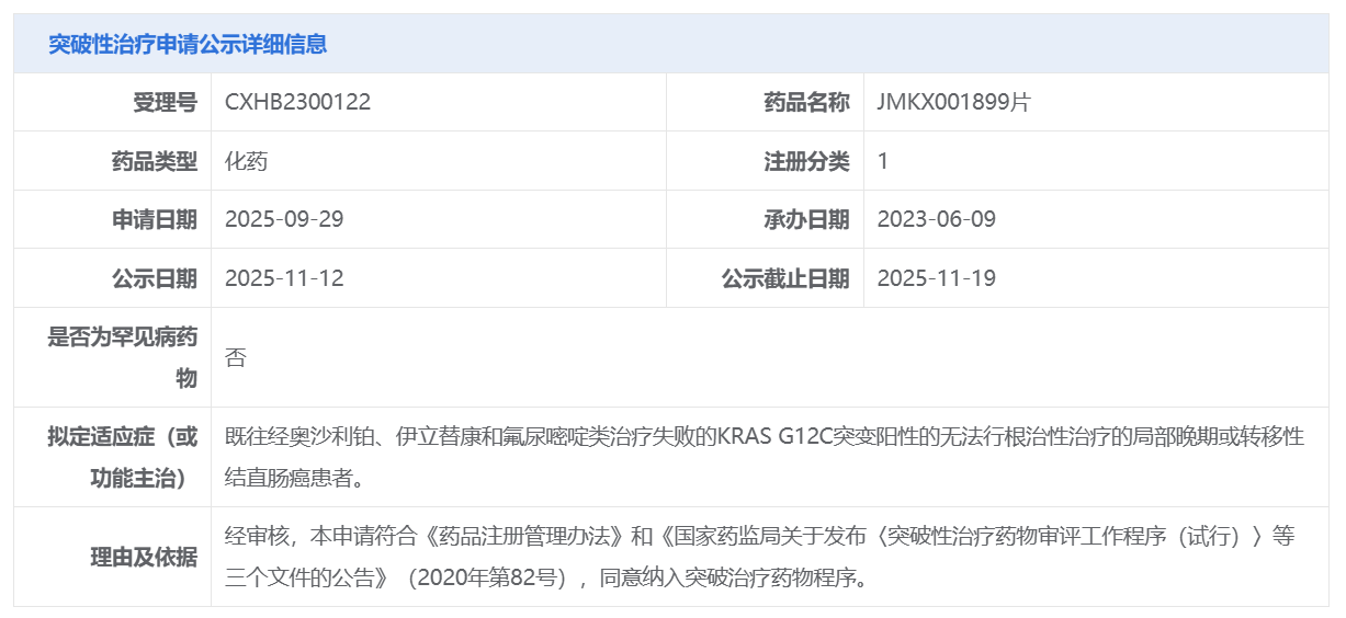 杭煜制药的JMKX001899片获CDE拟纳入突破性治疗品种