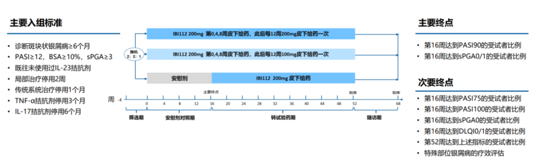 CLEAR-1 研究是一项针对中国成人中重度斑块状银屑病患者的多中心、随机、双盲、安慰剂对照Ⅲ期临床研究,旨在全面评估匹康奇拜单抗的有效性与安全性,纳入500例患者,以2:2:1比例随机分配至匹康奇拜单抗200mg组维持治疗组、100mg维持治疗组和安慰剂交叉组。