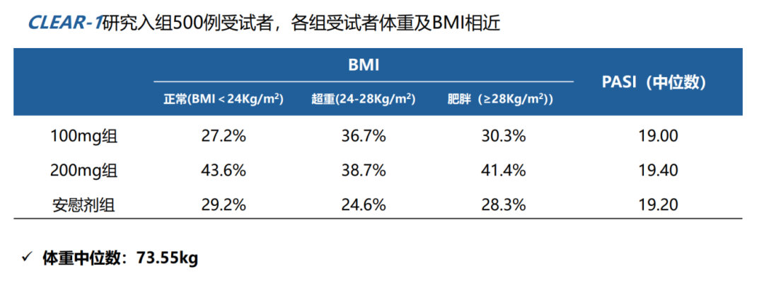 从基线数据来看,三组患者(100mg 组、200mg 组、安慰剂组)的 BMI 分层占比分布相近,体重中位数为73.55kg;同时,三组患者的基线 PASI 评分中位数也基本一致,无统计学差异。