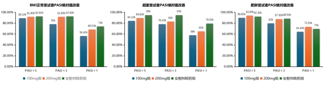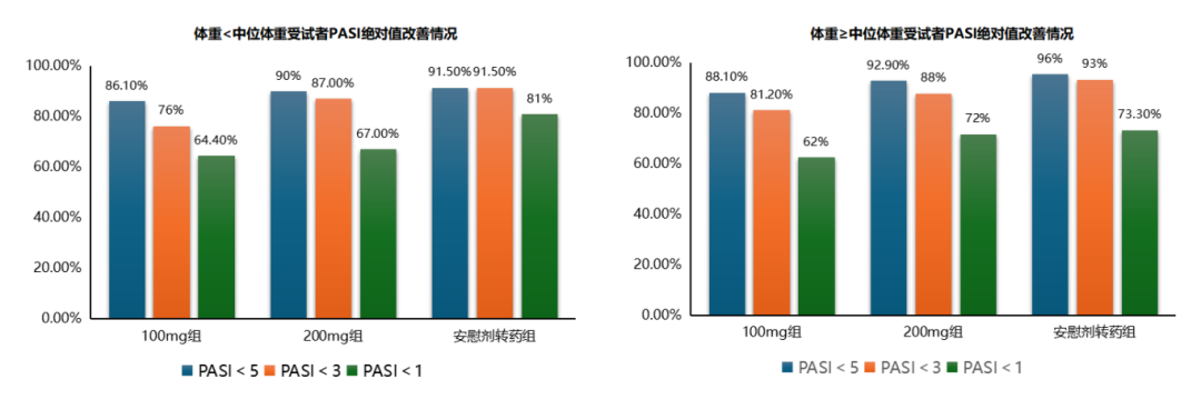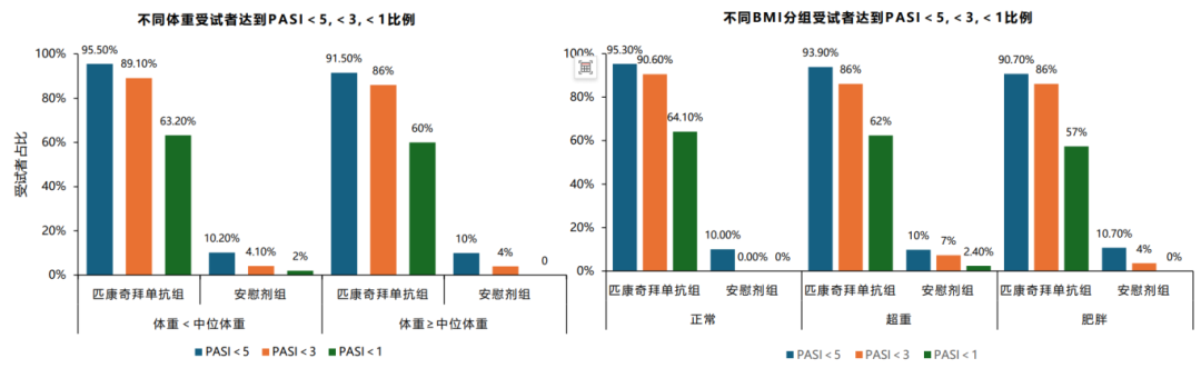 第 16 周的疗效评估表明,匹康奇拜单抗治疗组PASI<5、<3、<1比例远高于安慰剂组。且无论患者体重或 BMI 处于何种水平,匹康奇拜单抗均能快速、强效地控制进展,且疗效不受体重差异的影响。