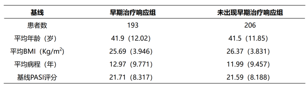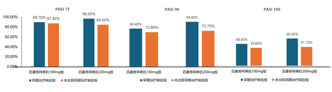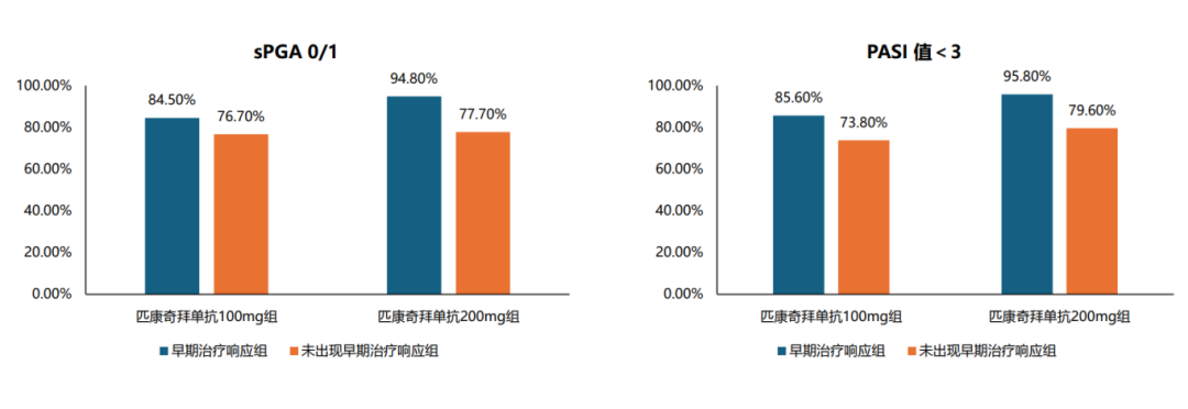 基于 CLEAR-1 研究的基础数据,研究团队也进一步开展了早期疗效应答对后续疗效影响的事后分析4。该分析以 “用药第4周是否达到 PASI 50”为标准,将匹康奇拜组患者分为“早期疗效应答组(193 例)”和 “非早期疗效应答组(206 例)”。早期疗效应答与非早期疗效应答的患者在年龄、BMI、病程以及PASI评分指标上相似。