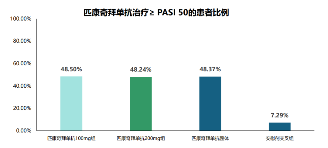 研究显示,用药第4周时,接受匹康奇拜单抗治疗的患者中,有近一半患者达到PASI 50应答(早期疗效应答),而安慰剂组仅有7.29%的患者达到相同水平。提示匹康奇拜单抗的早期响应率均显著高于安慰剂组。