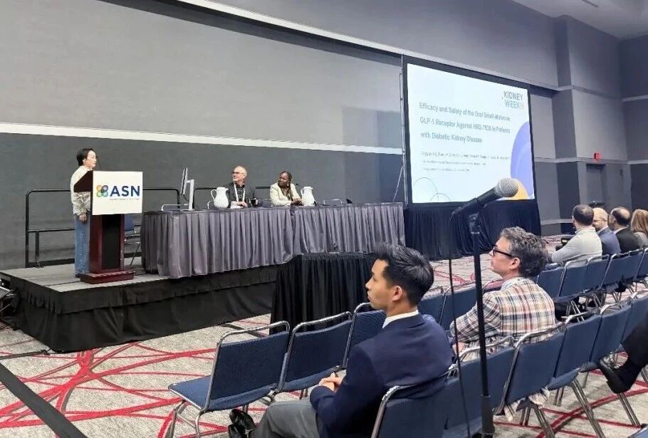 GLP-1受体激动剂(GLP-1RA)虽在注射剂型中展现出肾脏保护作用,然而口服小分子GLP-1RA在DKD人群中的治疗证据长期处于空白状态。在此背景下,恒瑞医药自主研发的口服小分子GLP-1RA HRS-7535的Ⅱ期研究成果[1],于11月5日至9日在美国休斯顿举行的2025年美国肾脏学会年会(ASN 2025)“最新突破性研究口头报告(Late-Breaking Research Orals)”专场重磅发布。HRS-7535是全球首个在DKD人群中完成概念性验证的口服小分子GLP-1RA,有望为DKD患者带来全新治疗选择。