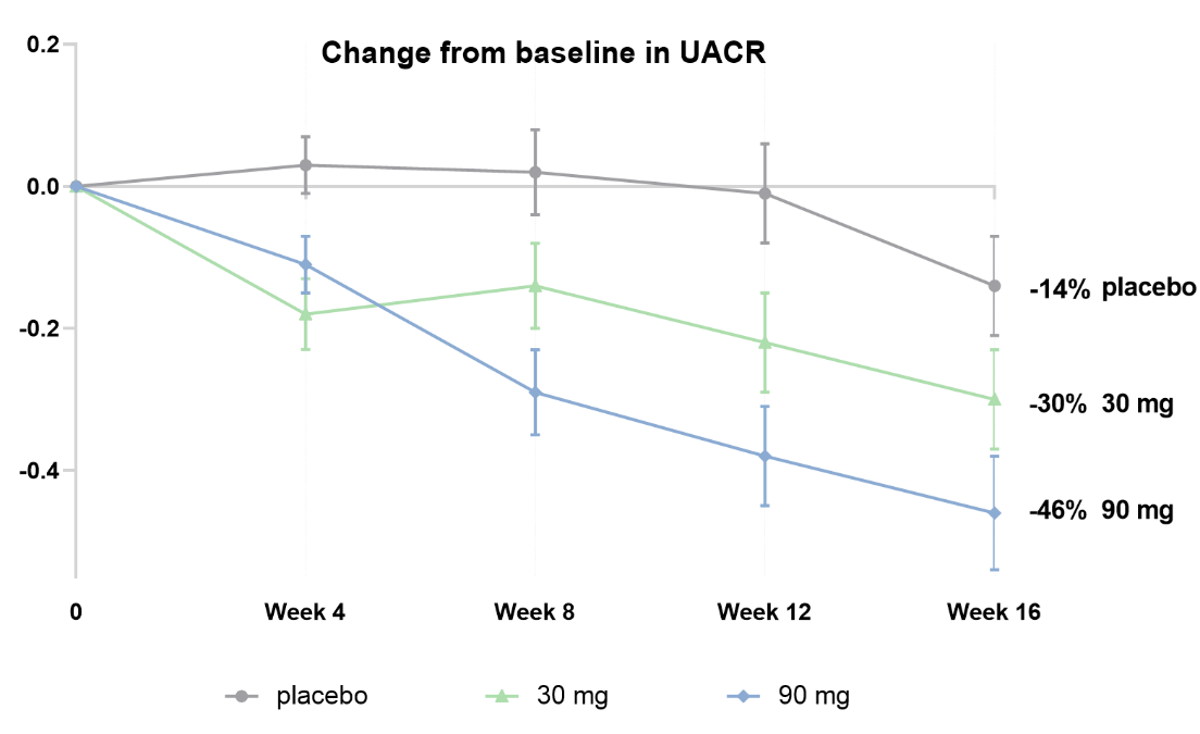 治疗16周时,HRS-7535 30 mg组、90 mg组UACR较基线分别降低30%、46%,显著优于安慰剂组的-14%,且90 mg组降幅较30 mg组更大,呈明确的剂量依赖性(图2)。