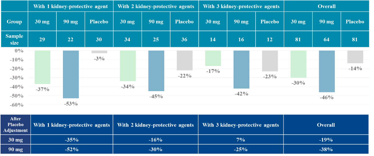 亚组分析显示,无论患者使用1种、2种还是3种肾脏保护药物,HRS-7535均能带来额外获益:当患者同时使用较少的肾脏保护药物时,HRS-7535治疗后UACR降幅更为显著,在合并使用1种肾脏保护药物的患者中,90 mg组的UACR降幅高达52%(经安慰剂校正后);在接受“RASi+SGLT2i +非奈利酮”三联治疗的患者中,90 mg组仍可使UACR额外降低25%(经安慰剂校正后)(图3)。