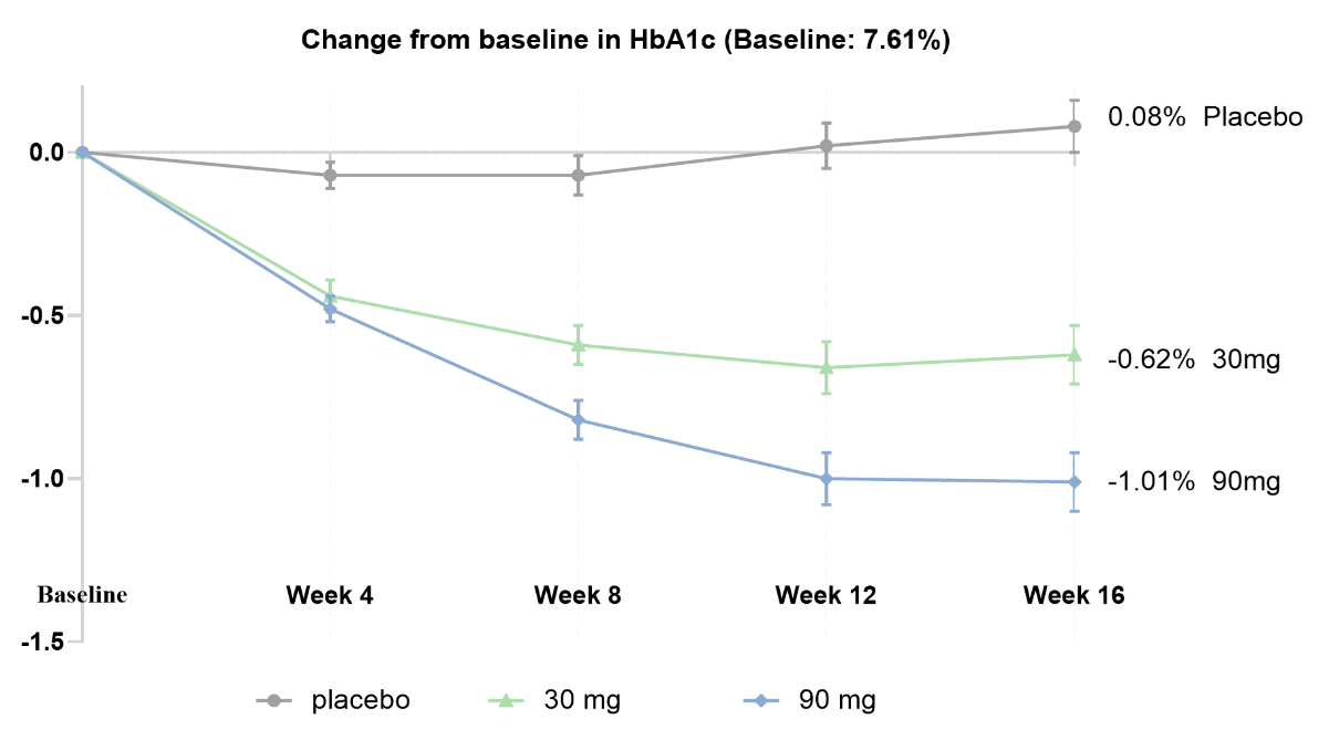 治疗16周时,HRS-7535 30 mg组、90 mg组HbA1c较基线分别降低0.62%、1.01%,优于安慰剂组的0.08%,且剂量越高,降糖效果越显著(图4)。