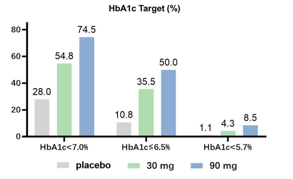 根据2024年改善全球肾脏病预后组织(KDIGO)和2025年ADA指南[2,3],DKD患者HbA1c目标为<7.0%,高危患者需进一步控制在≤6.5%。该研究结果显示,HRS-7535 90 mg组中,74.5%的患者达到HbA1c<7.0%(指南推荐目标),50.0%达到≤6.5%(高危人群严格目标),高于安慰剂组的28.0%与10.8%(图5)。