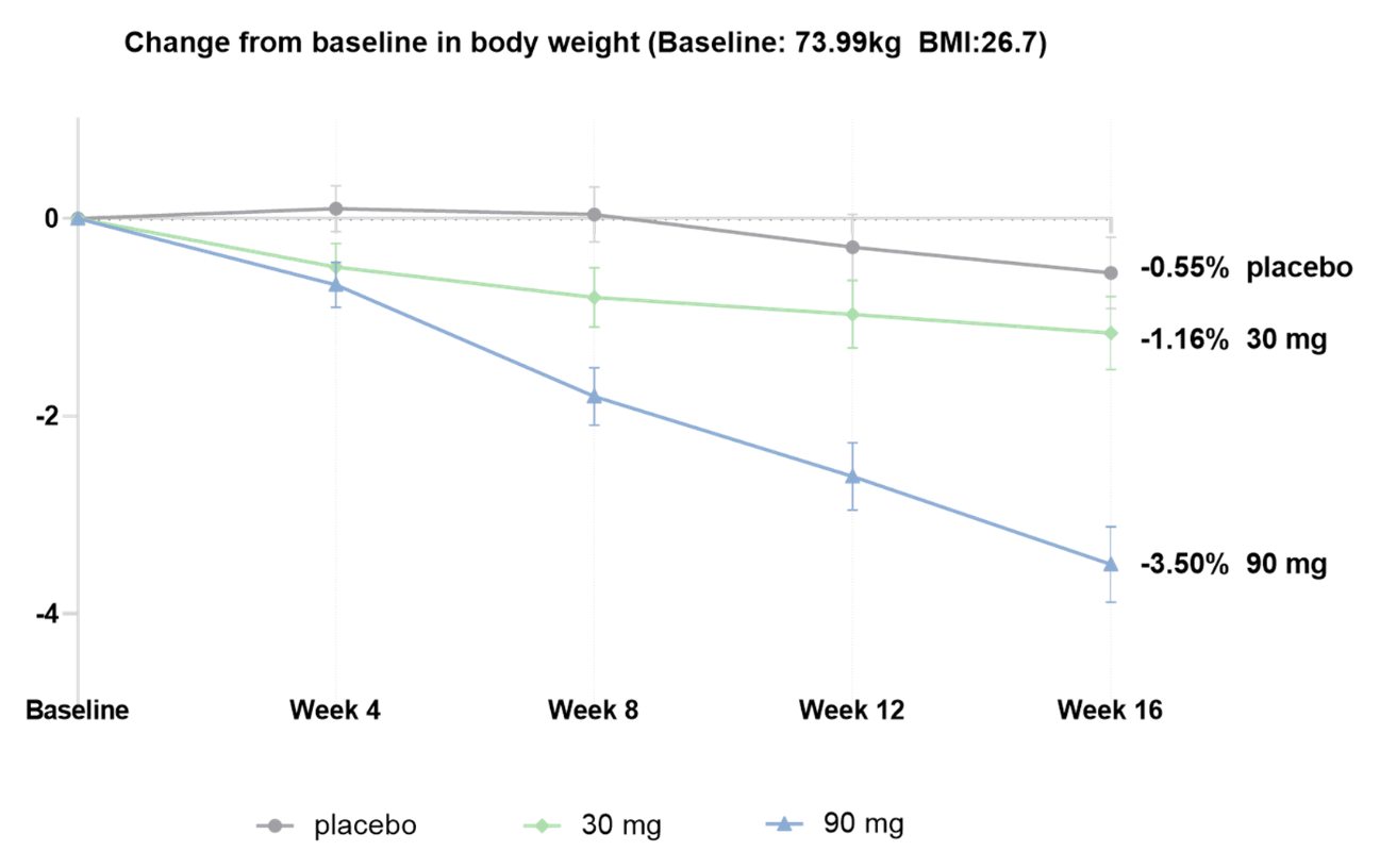 治疗16周时,HRS-7535 90 mg组体重较基线降低3.50%,优于安慰剂组的0.55%,且未观察到下降平台期(图6),长期用药或可持续获益。