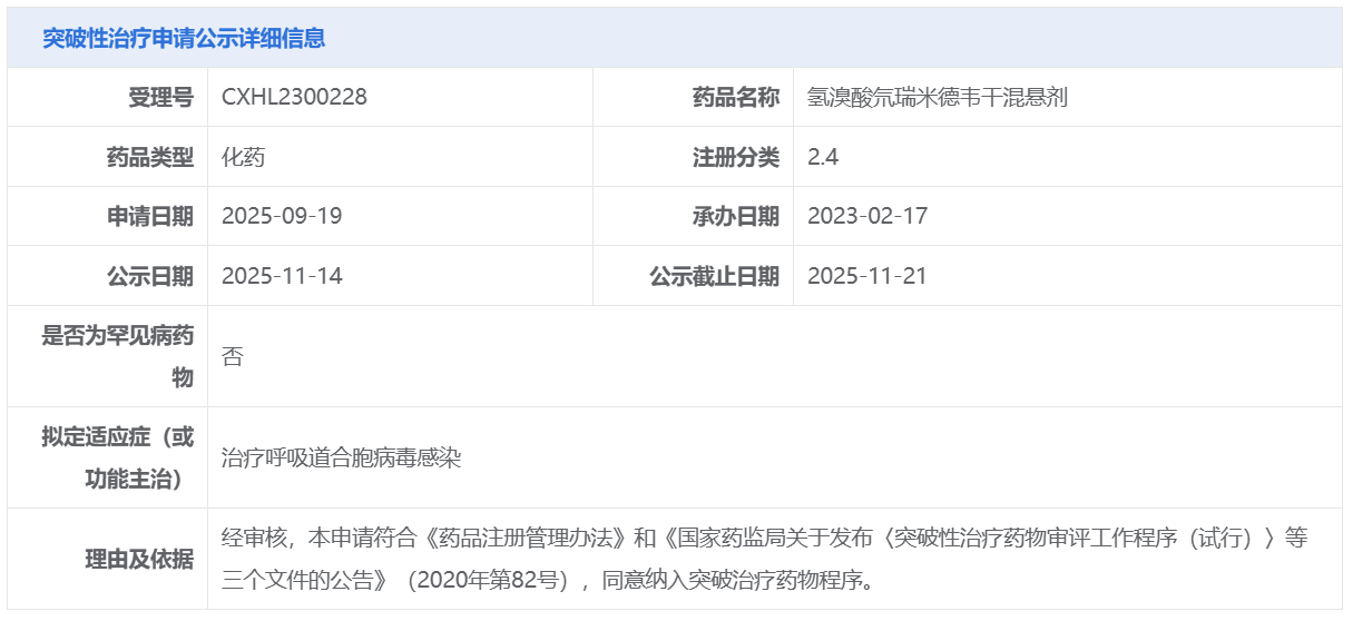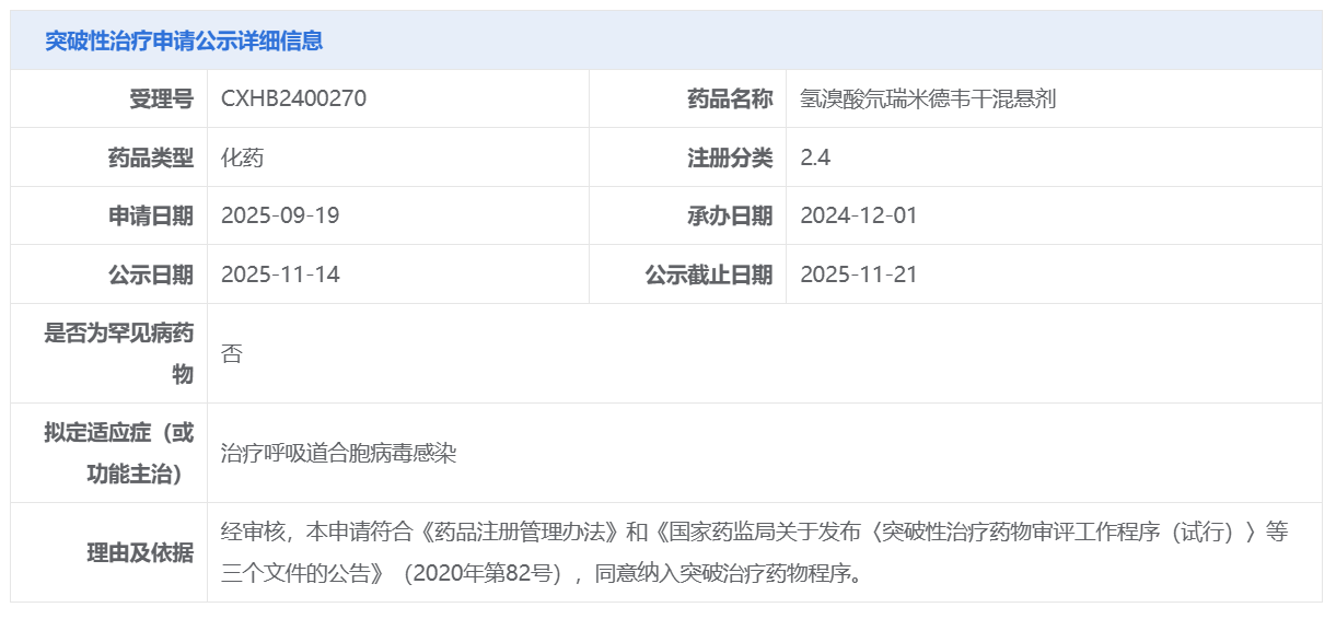 旺山旺水的氢溴酸氘瑞米德韦干混悬剂获CDE拟纳入突破性治疗品种