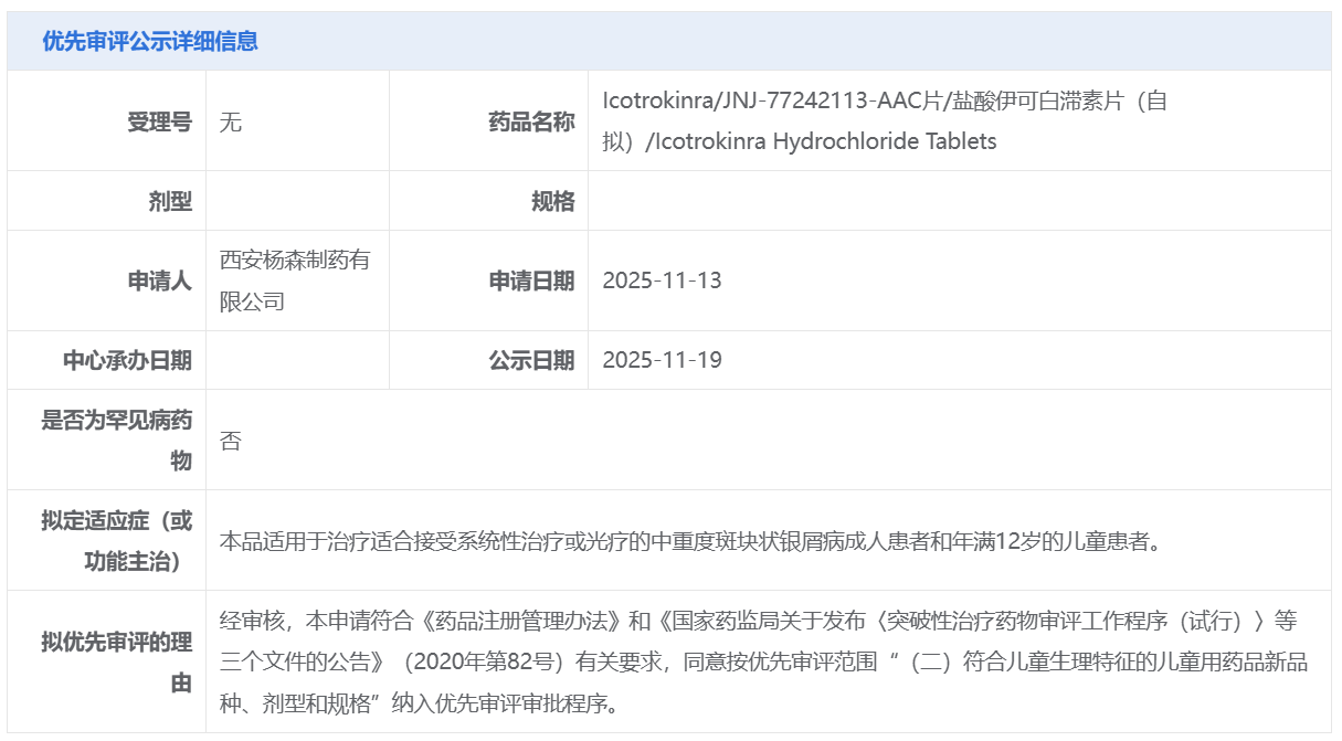 西安杨森的Icotrokinra获CDE拟纳入优先审评