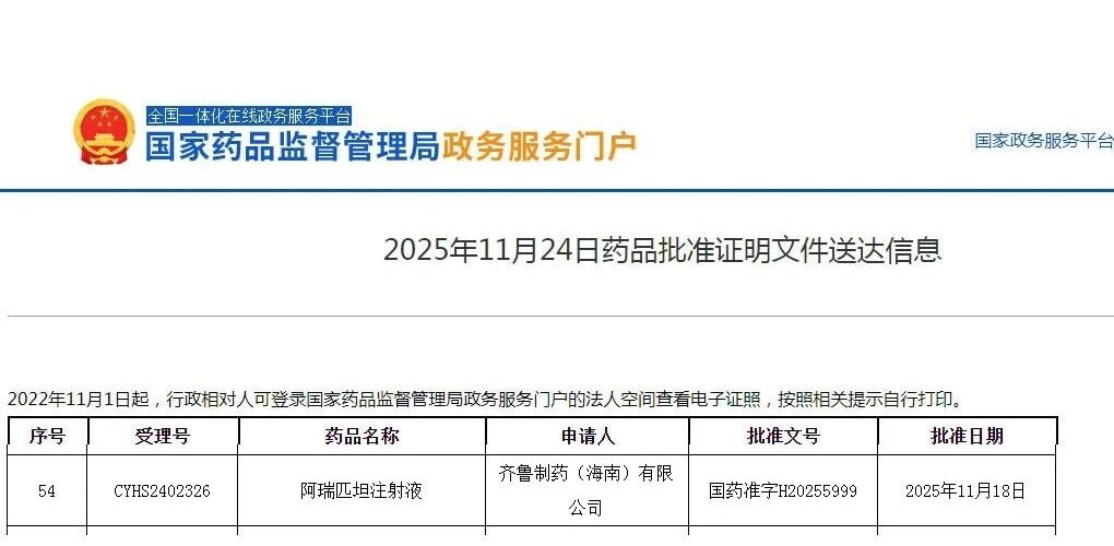 11月24日,据国家药品监督管理局官网公示,齐鲁制药重磅纳米乳制剂产品——阿瑞匹坦注射液(4.4ml:32mg)(欧瑞贝®)国内首家获得国家药监局批准上市,为成人术后恶心和呕吐(PONV)的预防带来新的国产用药选择。
