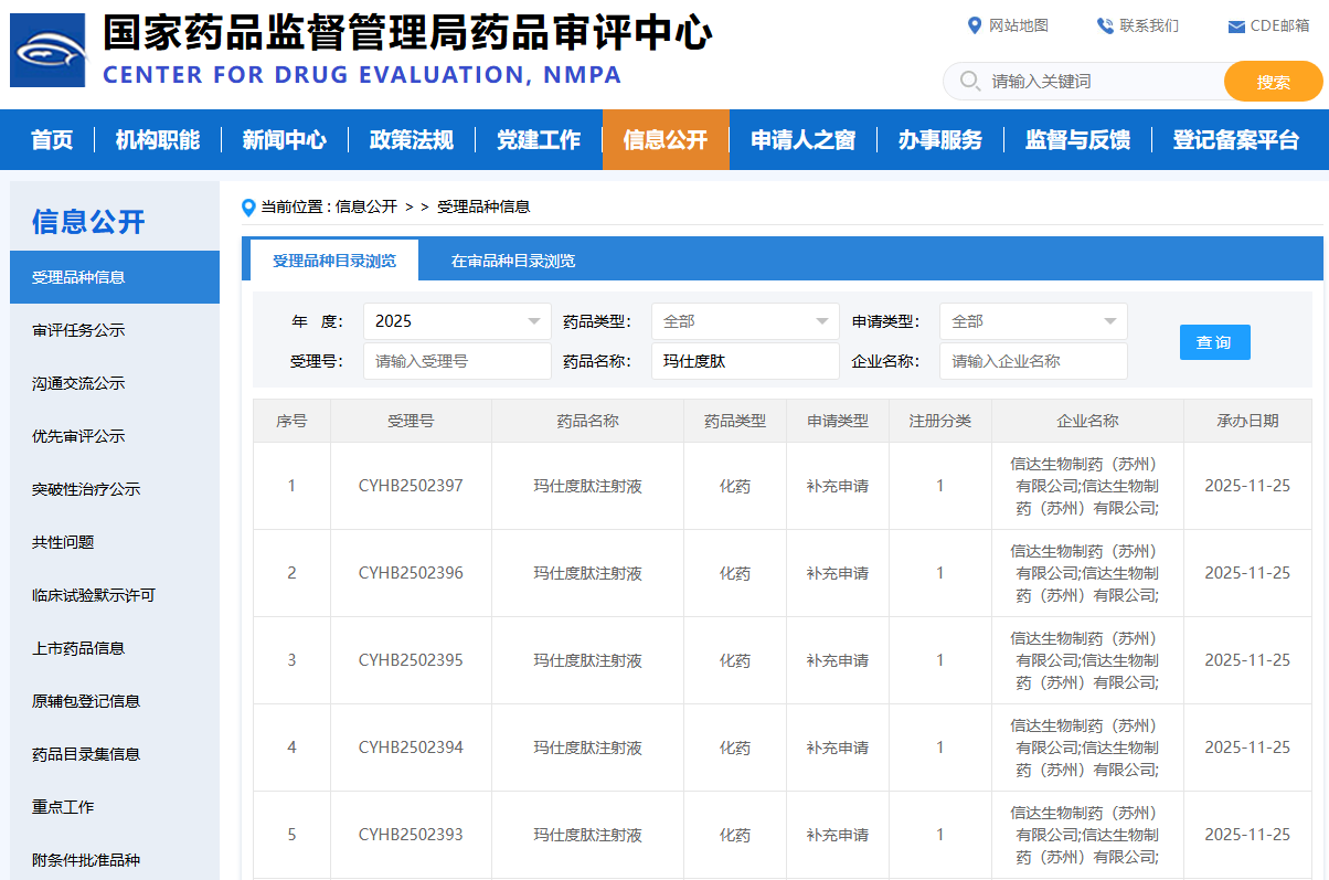 2025年11月25日,美国旧金山和中国苏州——信达生物制药集团(香港联交所股票代码:01801),一家致力于研发、生产和销售肿瘤、自身免疫、代谢及心血管、眼科等重大疾病领域创新药物的生物制药公司,今日宣布:信尔美®(玛仕度肽注射液,胰高血糖素[GCG] /胰高血糖素样肽-1[GLP-1] 双受体激动剂)高剂量9mg用于成人中重度肥胖患者长期体重控制上市申请已获中国国家药品监督管理局(NMPA)药品审评中心(CDE)受理。玛仕度肽有望在减重手术之外,为中国中重度肥胖人群提供一个强效、安全的新治疗选择。