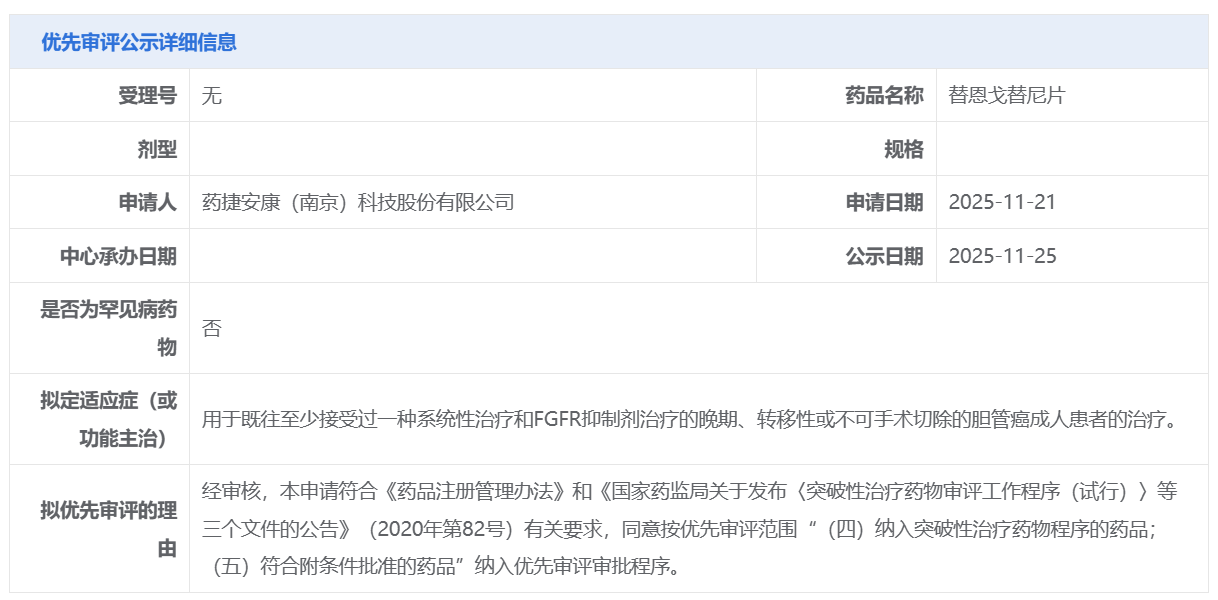 药捷安康的替恩戈替尼片获CDE拟纳入优先审评