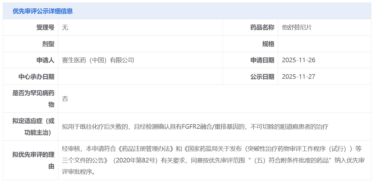 赛生医药的他舒替尼片获CDE拟纳入优先审评