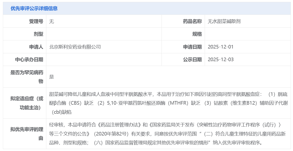 斯利安药业的无水甜菜碱散剂获CDE拟纳入优先审评