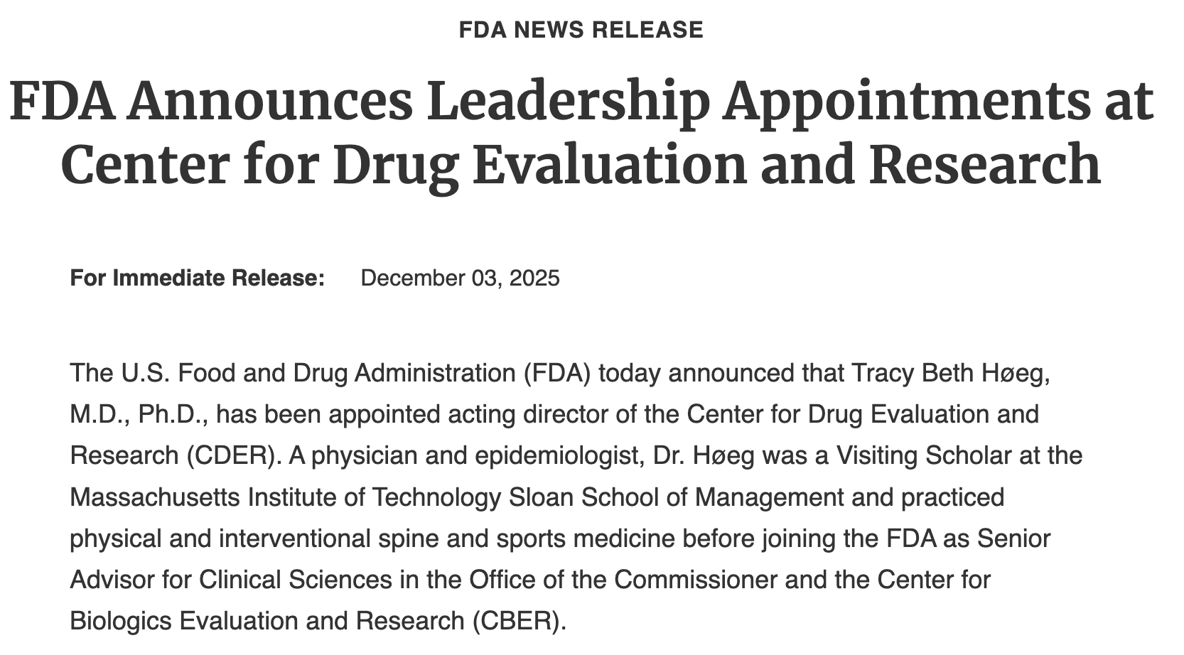美国时间12月3日,美国食品药品监督管理局(FDA)在官网宣布,任命Tracy Beth Høeg为FDA药品审评与研究中心(CDER)代理主任。前任CDER主任Richard Pazdur在位不到一个月,就因与FDA现任局长Marty Makary在几项核心政策上意见不合而离职。该中心今年已更换了五位主任。