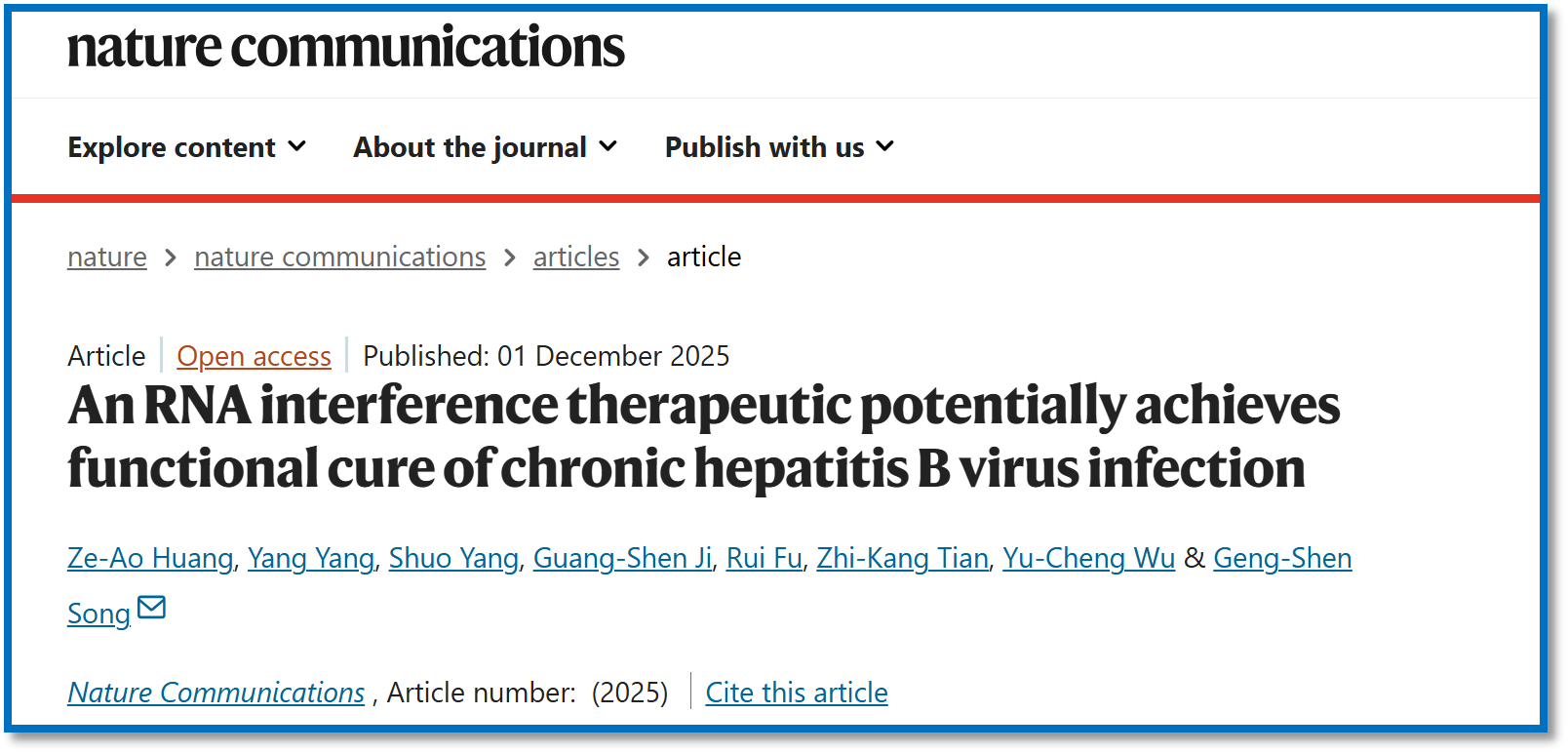 乙型肝炎病毒(HBV)慢性感染是全球重大公共卫生挑战,同时也是引发肝硬化和肝癌的主要诱因。病毒共价闭合环状DNA(cccDNA)在肝细胞核内稳定存在,是病毒持续感染和复制的核心根源。而高水平的乙肝表面抗原(HBsAg)引发的宿主免疫耗竭,导致传统的免疫调节剂疗效有限,使得HBV功能性治愈仍然是世界性难题。近日,悦康药业子公司北京悦康科创医药科技股份有限公司和杭州天龙药业有限公司联合在《Nature Communications》在线发表题为“An RNA interference therapeutic potentially achieves functional cure of chronic hepatitis B virus infection”的研究论文。该研究报道了一款靶向HBV S区的强效siRNA候选药物,其通过RNA干扰(RNAi)技术,靶向降解HBV前基因组RNA(pgRNA)和所有结构蛋白的转录本:一方面抑制病毒基因组生成,阻断病毒cccDNA池的补充;另一方面通过抑制病毒蛋白(尤其是HBsAg)合成,减少新病毒颗粒和亚颗粒的产生,解除高水平抗原对宿主免疫系统的抑制,为免疫系统的重建提供关键窗口。