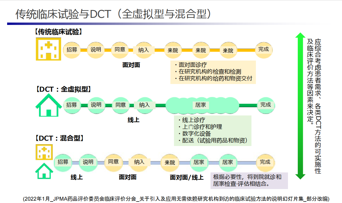 •在日本,从引入过程中的课题和可行性角度来看,DCT的主流模式并非完全远程实施、无需患者前往研究机构的“全虚拟型”,而是采用“混合型”——将在线诊疗、上门护理、卫星医疗机构利用等线上服务与研究机构的线下访问相结合。
