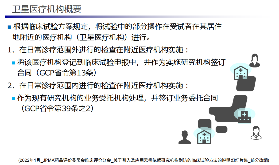 首先,关于卫星医疗机构,如果受试者在其居住地附近的医疗机构中进行日常诊疗范围内的检查,应按照“作为研究机构的业务受托机构进行处理,并签订业务委托合同”的规定执行,这在GCP省令第39条之2(业务委托等)中有记载。