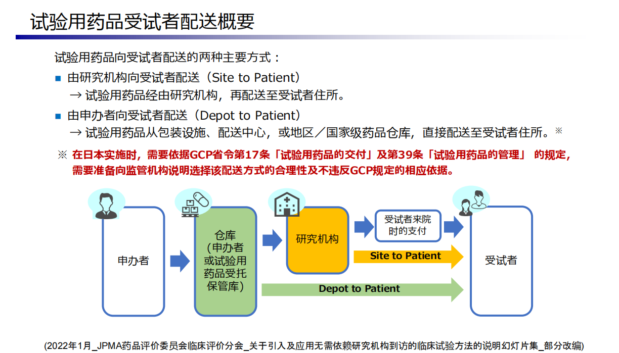 若欲采用 Depot to Patient的配送方式,则必须事先向PMDA说明选择该配送方式的合理性,并提供不违反GCP规定的依据,以取得监管机构的理解。(参见图3及参考文献/资料2,3)