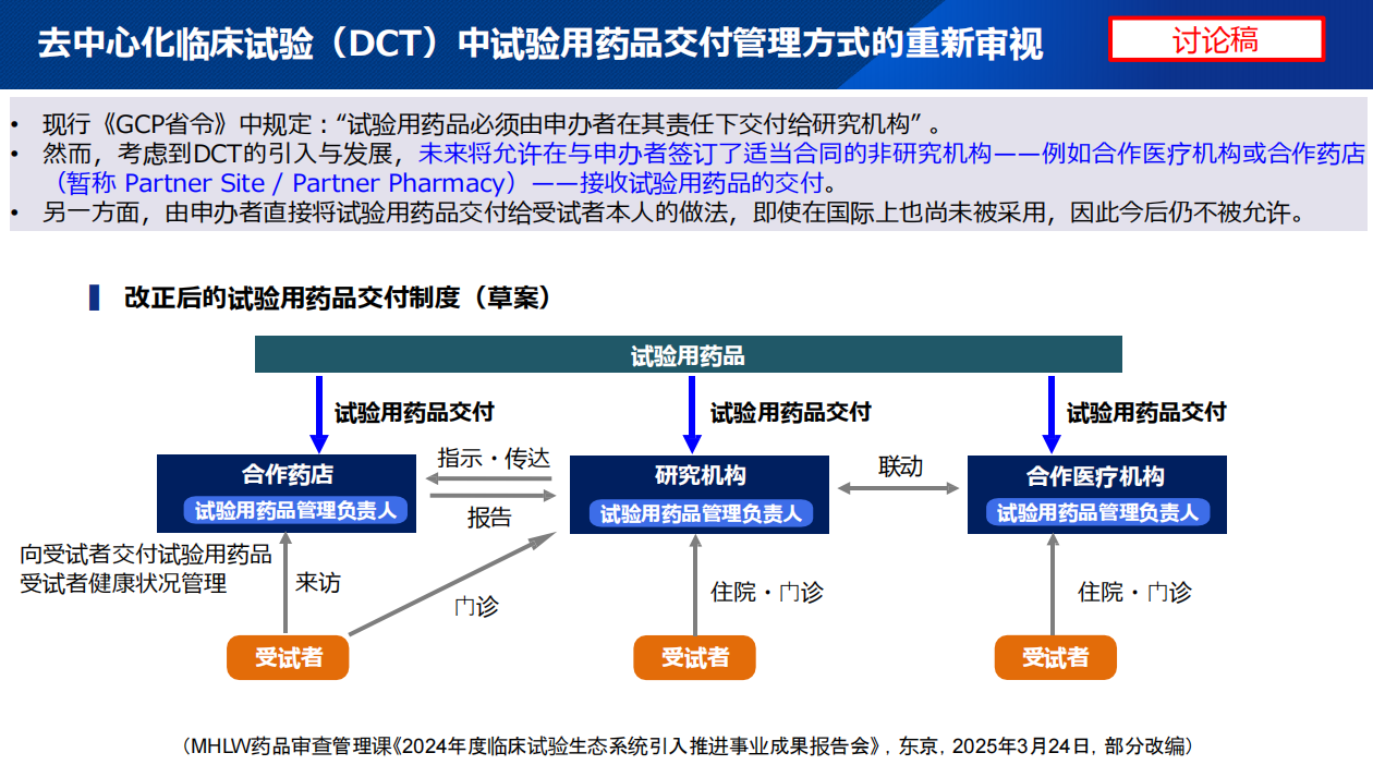 •今后,日本正通过修订《GCP省令》,为推进DCT铺平道路。明确规定可实施电子知情同意,推动流程数字化;更加灵活合作机构的定位,使“卫星医疗机构”等模式能切实推进;同时允许试验用药品从合作药店或合作医疗机构直接交付给受试者。