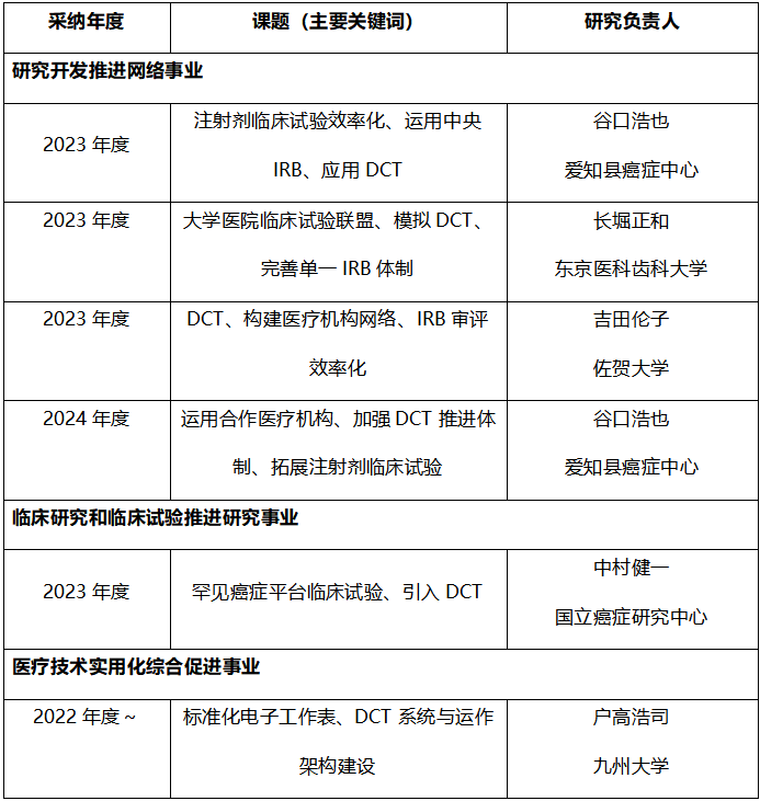 此外,日本医疗研究开发机构(Japan Agency for Medical Research and Development, AMED)自2022年起已启动多项关于医疗机构DCT引入体系建设的研究项目。(参见表1)