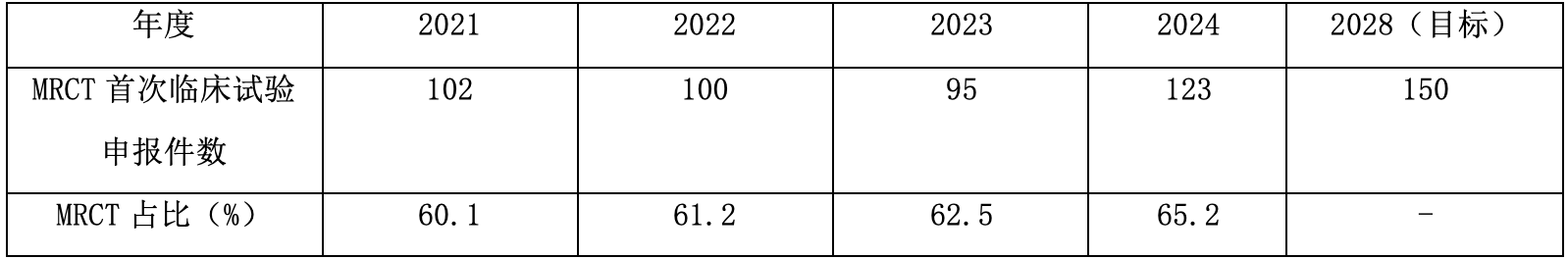 日本在2021~2024年度4年间的MRCT实施件数为平均每年105件,要实现2028年度的目标,需要在未来3年内增加约40%。(参见表2)