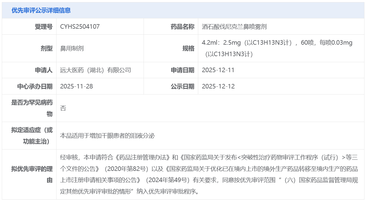 远大医药的酒石酸伐尼克兰鼻喷雾剂获CDE拟纳入优先审评