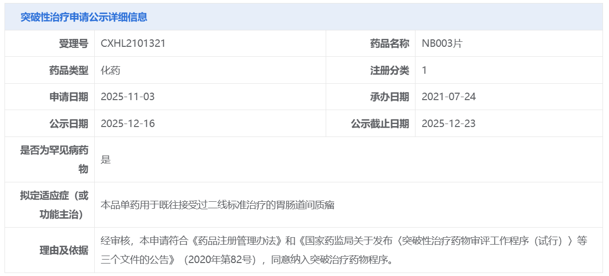 新湾科技的NB003片获CDE拟纳入突破性治疗品种