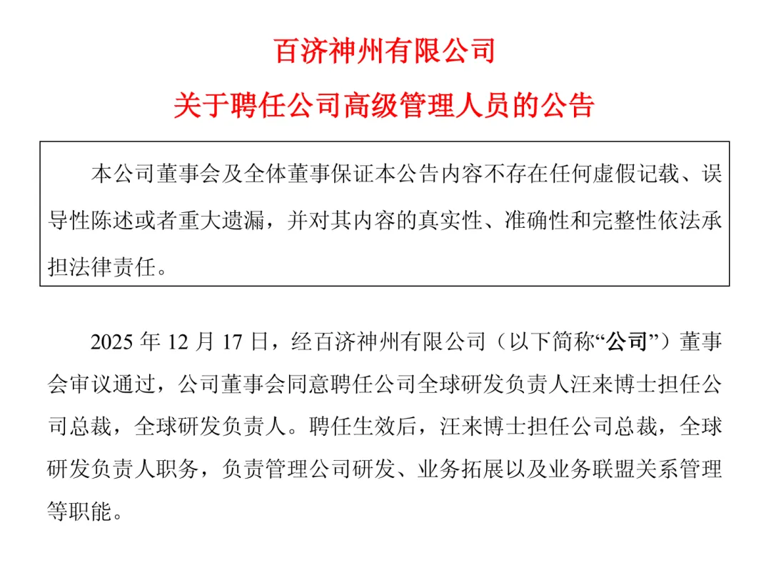 12月19日,百济神州发布人事公告,宣布公司全球研发负责人汪来博士出任总裁,同时保留全球研发负责人职务,全面负责公司研发、业务拓展及业务联盟关系管理等核心职能。百济神州管理高层向研发客确认:“吴晓滨博士的职务没有变动,依然担任百济神州总裁兼首席运营官,并全面负责公司全球商业化、生产及供应链业务。”