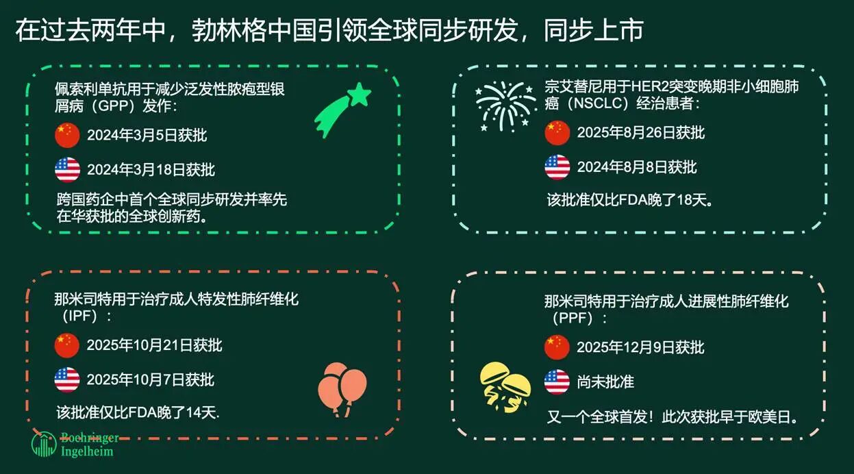 2025年12月10日,勃林格殷格翰宣布,基于迄今为止规模最大的PPF临床试验FIBRONEERTM-ILD,那米司特在中国率先获批用于治疗成人PPF患者,勃林格也再次实现全球创新药在中国首发,早于欧美日。