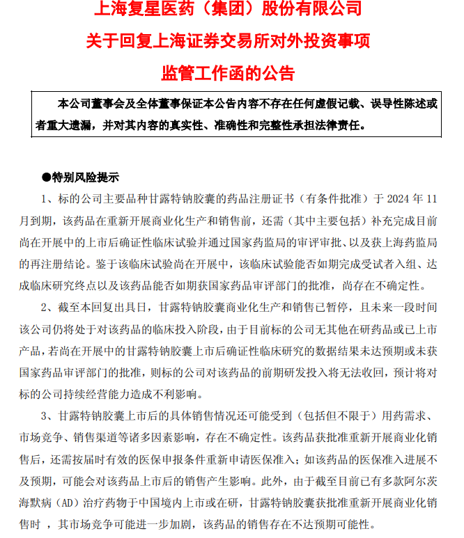上海复星医药(集团)股份有限公司关于回复上海证券交易所对外投资事项监管工作函的公告