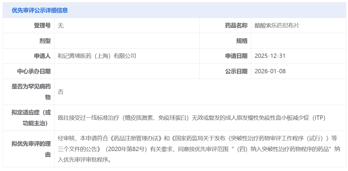 和记黄埔的醋酸索乐匹尼布片获CDE拟纳入优先审评