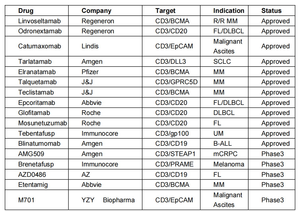 截至目前,全球已获批12款TCE疗法,其中9款聚焦血液肿瘤(表1)。在实体瘤领域,2022年获批的Tebentafusp将葡萄膜黑色素瘤患者1年生存率从59%提升至73%,2024年获批的Tarlatamab在2/3线小细胞肺癌(SCLC)中实现40%客观缓解率(ORR),成功打破传统治疗僵局。在自身免疫病领域,TCE通过选择性清除自身反应性B细胞提供精准方案,blinatumomab等已证实可有效降低疾病活动度,对多种B细胞驱动的自身免疫疾病均显示出疗效。TCE的临床探索持续深入,其在疗效增强与安全性优化方面的优势逐步显现,为免疫治疗的进阶发展提供了重要支撑。