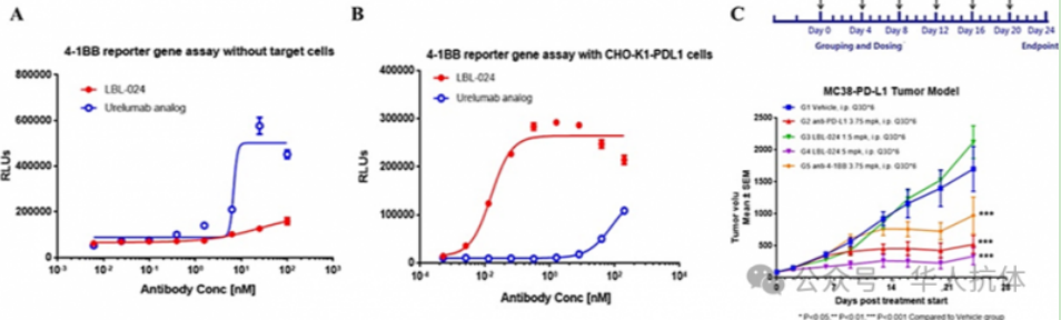 图1. (A) 没有PD-L1靶细胞的情况下,LBL-024不激活4-1BB,而Urelumab analog则表现出活性。(B) 存在PD-L1靶细胞时,LBL-024能够激活4-1BB,且强于Urelumab anolog。(C) 在 MC38-PD-L1小鼠模型中,LBL-024(5 mg/kg)显示出优于PD-L1或4-1BB单药治疗的抗肿瘤效果。