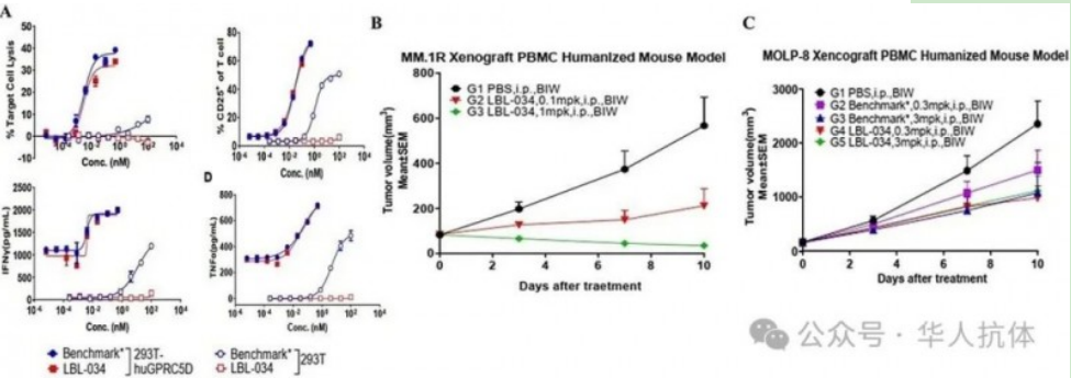 图2 (A)LBL-034在GPRC5D的靶细胞存在时,条件性激活T细胞。(B)0.1 mg/kg剂量下,LBL-034在MM.1R异种移植PBMC人源化小鼠模型中显著抑制肿瘤生长。(C)LBL-034在MOLP-8异种移植PBMC人源化小鼠模型中明显抑制肿瘤生长。
