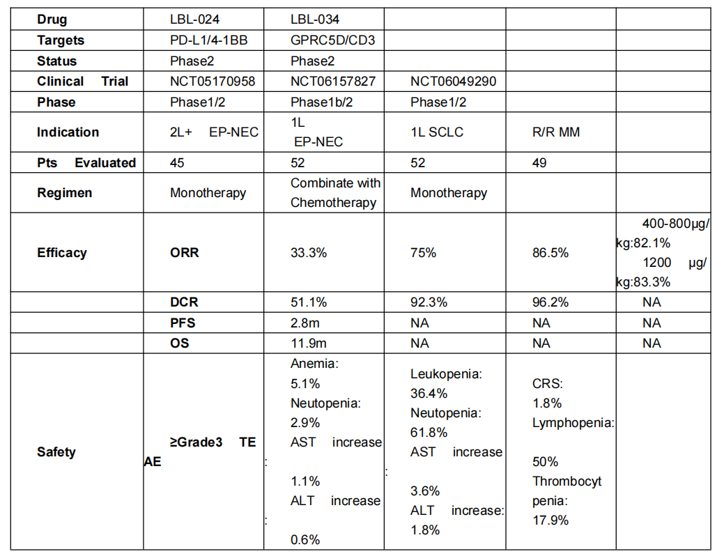 1.LBL-024:全球唯一进入关键临床阶段的PD-L1/4-1BB双特异性抗体,对PD-L1亲和力比4-1BB高300余倍,确保肿瘤微环境富集,体现出明显优于竞品的差异化分子设计(图1)。临床数据显示,单药治疗2线及以上的晚期神经内分泌癌(NEC)的ORR达33.3%、疾病控制率(DCR)为51.1%、中位总生存期(OS)达11.9个月,显著优于NEC其他疗法的历史数据;联合化疗一线治疗NEC及SCLC,ORR分别达75%和86.5%,DCR均超90%,≥3级肝毒性发生率低于4%,安全性优异(表2)。该项目目前正在多种实体瘤中开展临床试验。