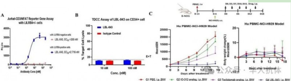 3.LBL-043:靶向LILRB4和CD3的TCE,以来治疗MM和M4/M5急性髓系白血病(AML)。LILRB4在肿瘤细胞及MDSCs中高表达,正常造血干细胞中低表达,靶向窗口理想。LBL-043采用2:1不对称结构,临床前研究显示其对肿瘤细胞强效杀伤,对造血干细胞无明显损伤,在人源化小鼠模型中实现持久抗肿瘤应答,食蟹猴毒理学研究表现出良好耐受性(图3)。