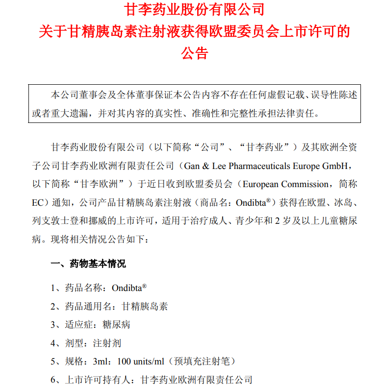甘李药业宣布甘精胰岛素注射液(商品名:Ondibta)的上市许可获欧盟批准