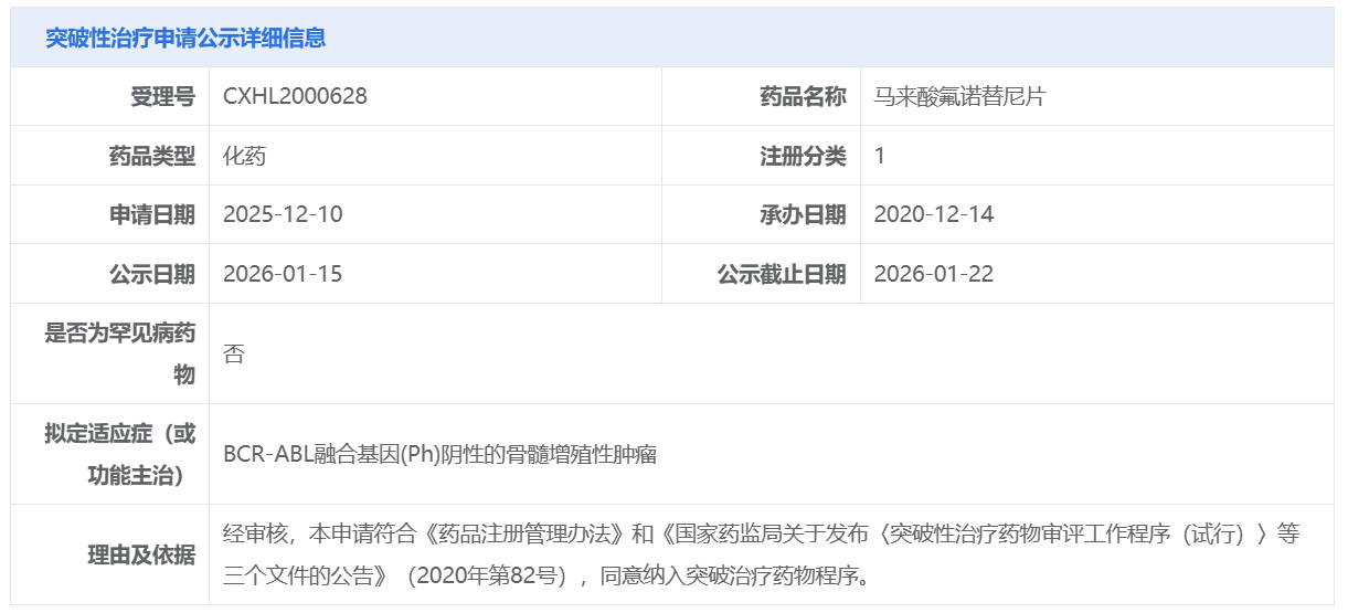 赜灵生物的马来酸氟诺替尼片获CDE拟纳入突破性治疗品种