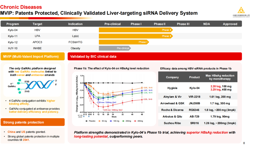 ·Kylo-04:基于MVIP平台开发的Kylo-04在乙肝(HBV)治疗的Ib期临床试验中,取得了优于同行的HBsAg(乙肝表面抗原)降低效果,400mg剂量组降幅高达3.29log,展现出卓越的疗效和持久性以及MVIP平台高效的递送效率。