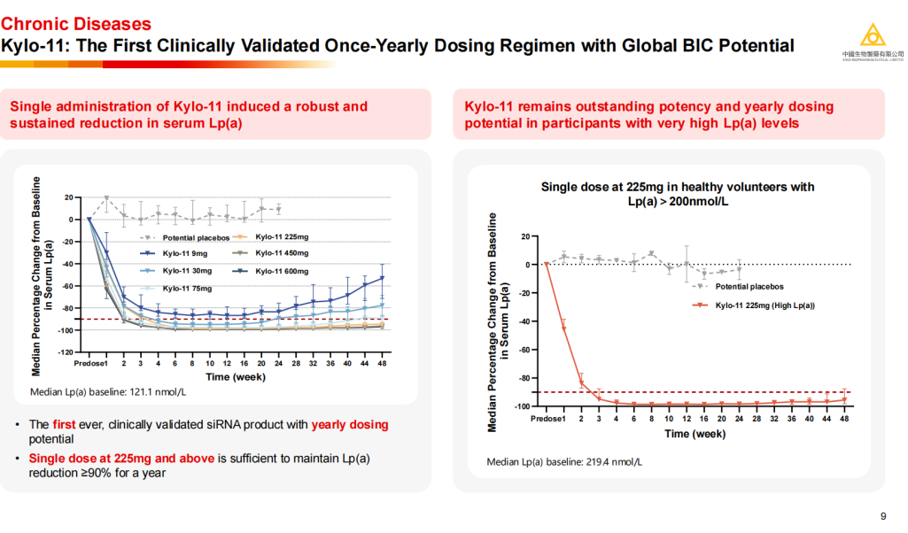 ·Kylo-11:基于该平台开发的治疗高Lp(a)血症的小核酸产品Kylo-11,临床研究数据显示单次给药225mg,即可诱导血清Lp(a)水平降低超过90%,效果持续时间长达一年;即使在基线Lp(a)水平极高的受试者中,Kylo-11依然能实现并维持约90%的降幅,展现了全球同类最佳(BIC)的潜力,有望为心血管疾病的预防和治疗带来革命性改变。