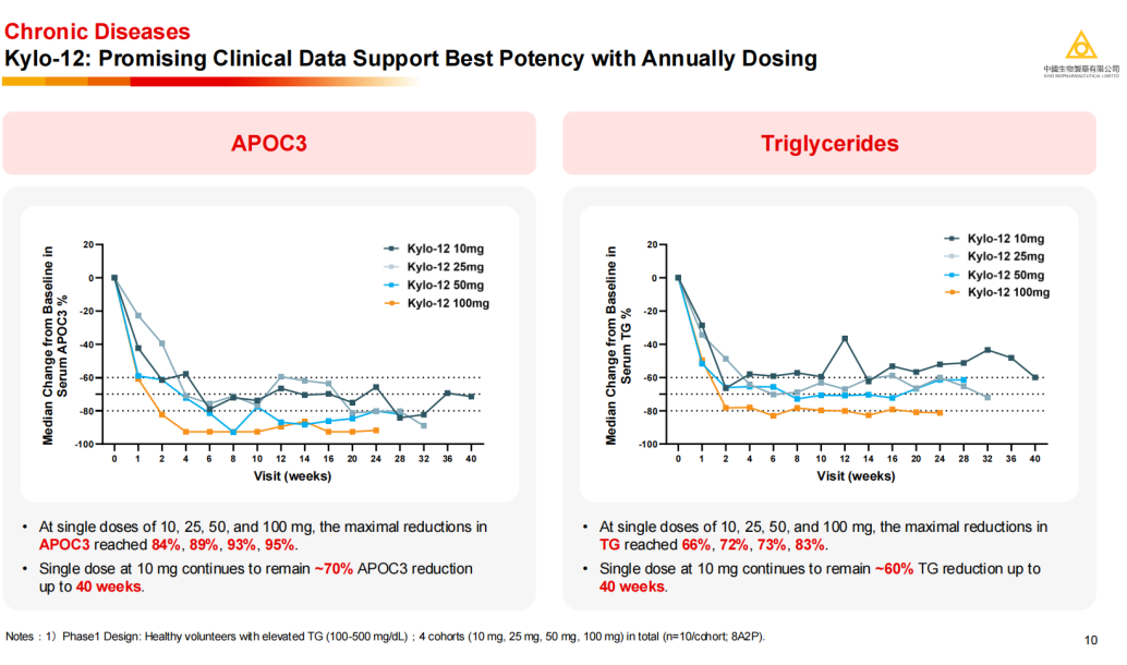 ·Kylo-12:基于该平台开发靶向APOC3的Kylo-12,在针对高甘油三酯血症(sHTG)的治疗中也显示出强大的临床潜力,单次给药10mg即可在40周后仍维持约70%的APOC3和约60%的甘油三酯(TG)降幅,且疗效呈现显著剂量依赖性,预示其同样具备一年给药一次即可实现显著获益的潜力。